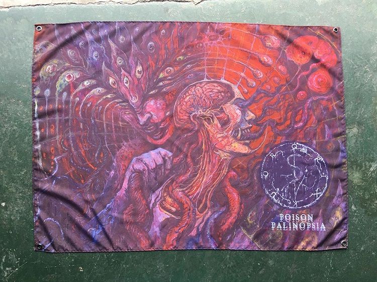 Official Qrixkuor Poison Palinopsia poster flags. Each flag measures 3 ft by 4 ft (120 cm x 90 cm). Four grommets for easy hanging.
